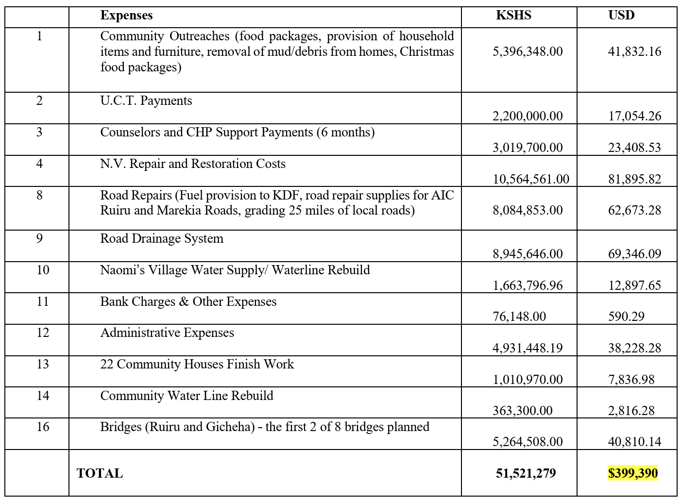 Summary of Expenditures – Naomi’s Village Flood Relief Efforts
